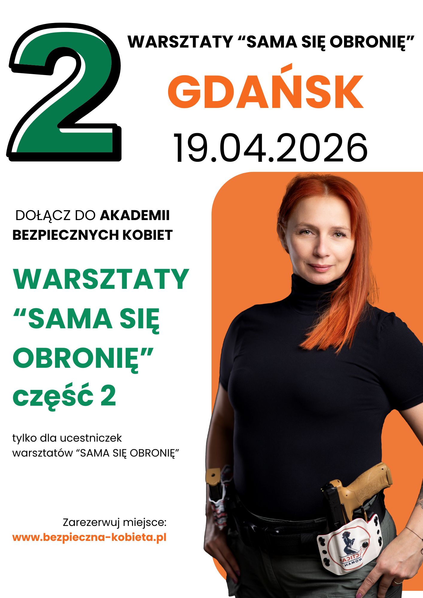 Pamiętaj, że udział w drugiej części warsztatów„SAMA SIĘ OBRONIĘ: Siła i Pewność Siebie” jest możliwy tylko po ukończeniu pierwszej części. Jeśli jeszcze nie uczestniczyłaś w „SAMA SIĘ OBRONIĘ”, zapisz się do Akademii Bezpiecznych Kobiet!